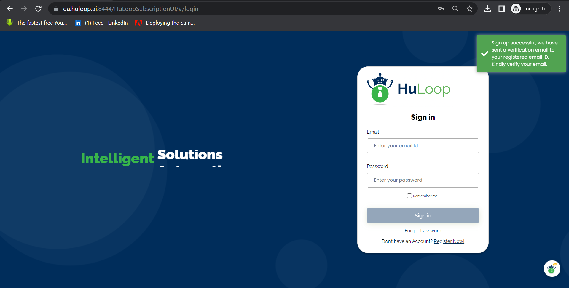 Once user clicks on Sign up button, a successful message will be shown to the user saying “Sign up successful, we have sent a verification email to your registered email Id. Kindly verify your email“.