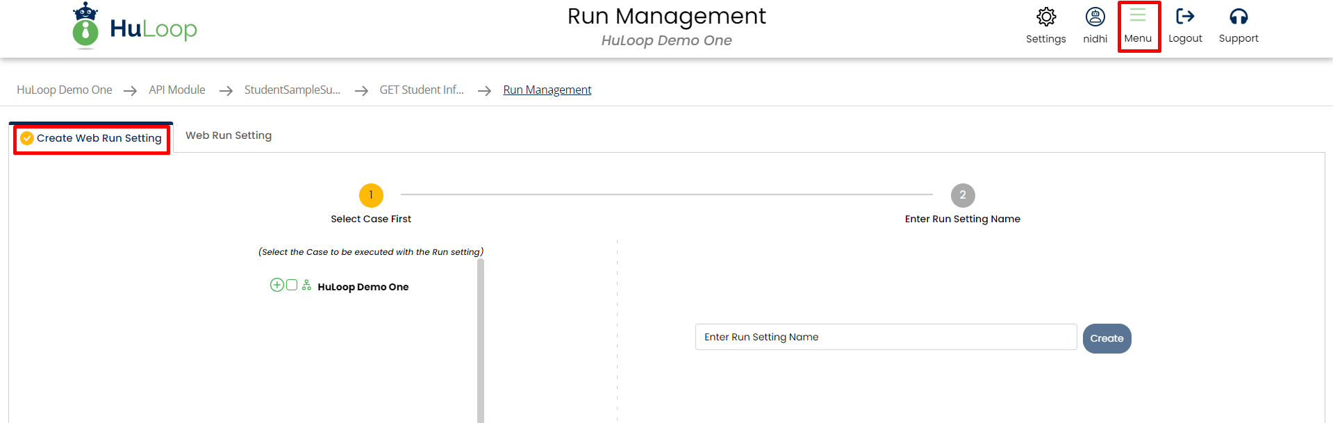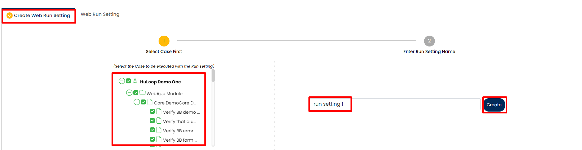 Here, you have to give a run setting name and select one or multiple test cases by expanding the project tree present on the right hand side of the page and then click on Create Run Setting.