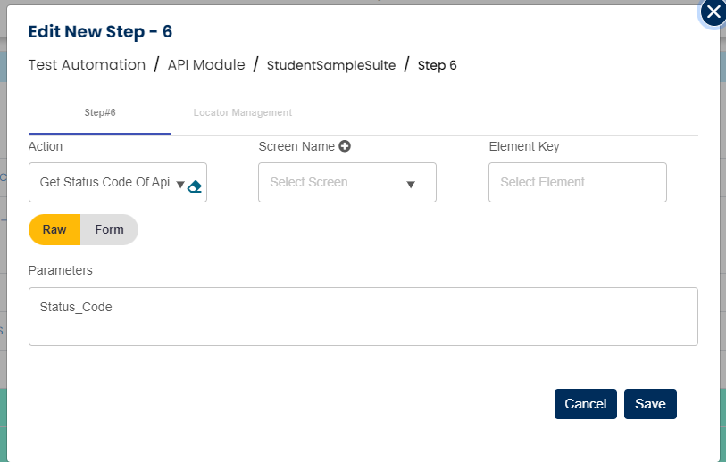 Select the Get Status Of Api Request command from the action drop-down, Leave Screen Name and Element as blank. Define a variable into Parameters section. It would look like as shown below: