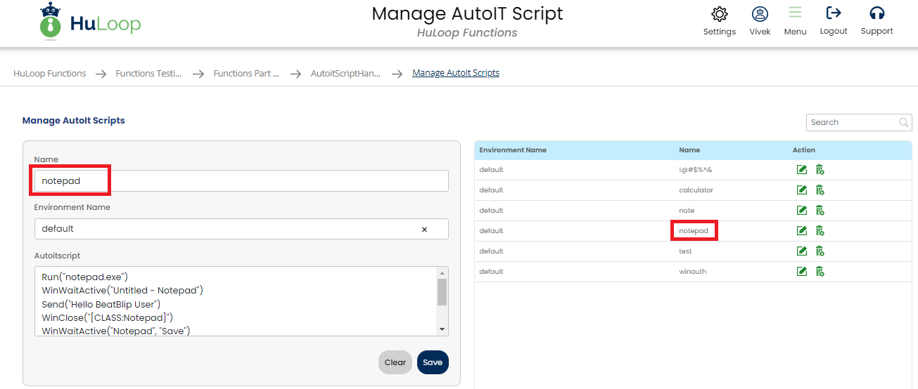Note: Name defined in Manage AutoItscripts will be used in the function to execute this script.