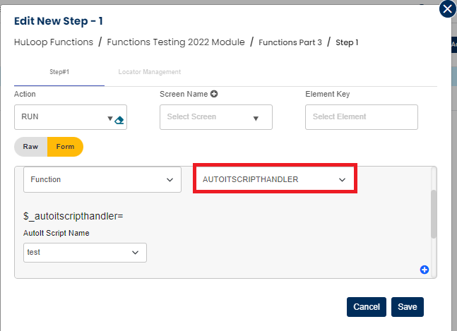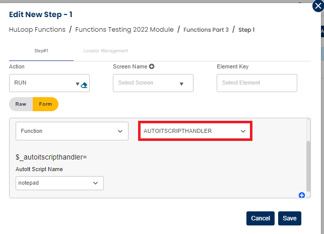 Select RUN command from the action dropdown and leave Screen and Element key as blank, edit parameter section and click on Form, select functions from the dropdown and select AUTOITSCRIPTHANDLER function. Provide the name of Autoit script in the form.