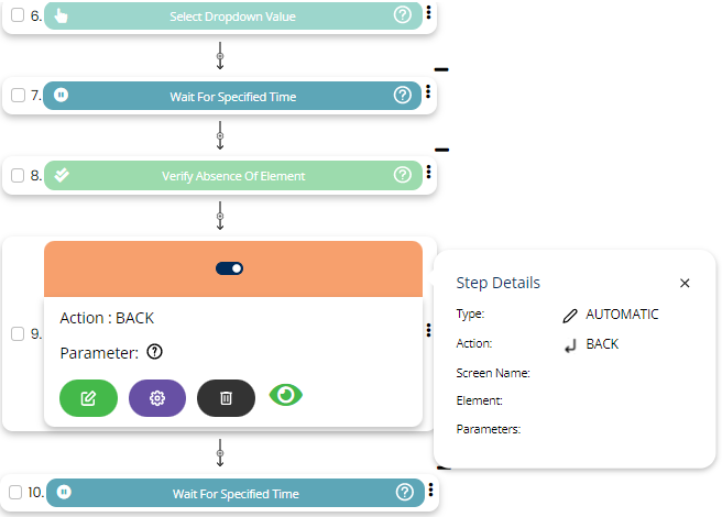 Select BACK command from the action drop down, leave Screen name, Element key and parameter section blank as shown below: