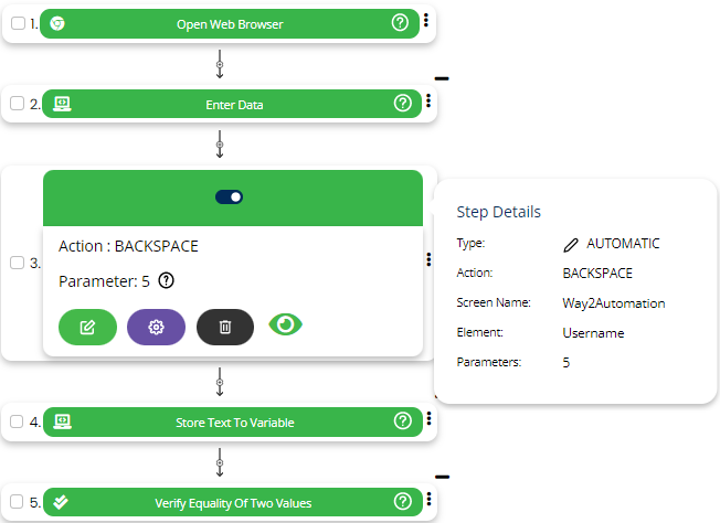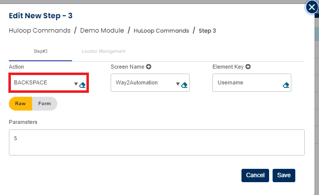 BackSpace is used to press backspace in the provided locator for count mentioned in parameter section.