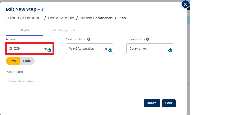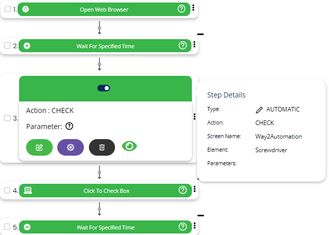 Select CHECK command from the action drop down, select desired Screen name and Element and leave the parameter section blank as shown below: