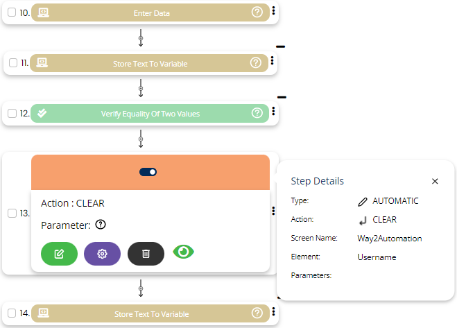 Select CLEAR command from the action drop down, select desired Screen name and Element key and leave the parameter section blank as shown below: