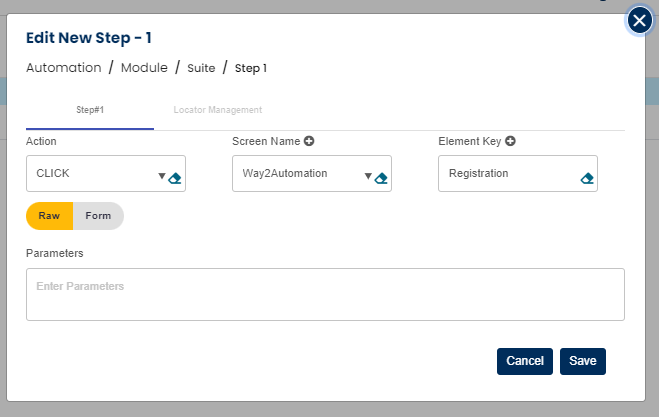 Select CLICK command from the action drop down, select desired Screen name and Element and leave the parameter section blank as shown below: