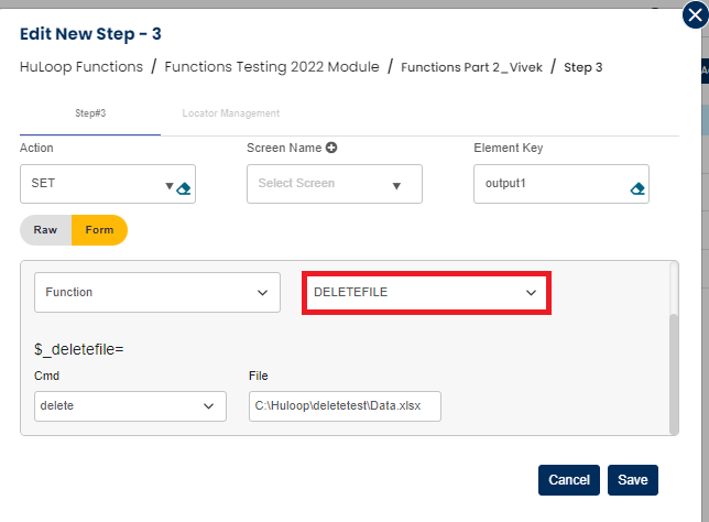 Select SET command from the action dropdown and provide a variable name in Element key where output will be stored, edit parameter section and click on Form, select functions from the dropdown and select DELETEFILE function. Provide file path that you want to delete and click on save icon.