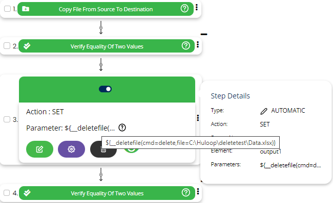 If file is deleted successfully then it will return true in the variable defined in the Element key else it will return false. This variable can be further used in subsequent steps for verification.