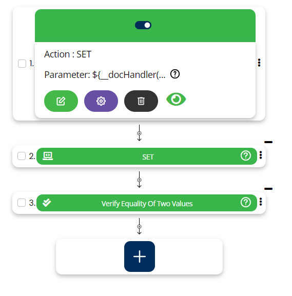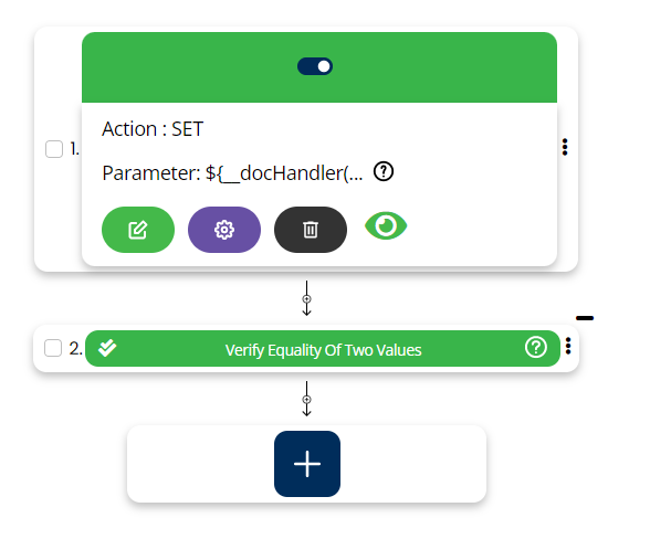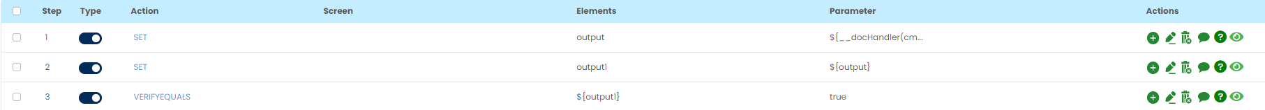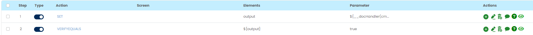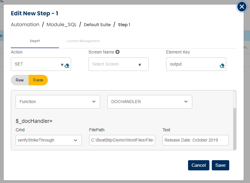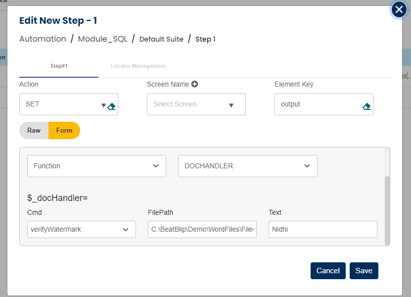 Select SET command from the action dropdown and provide a variable name in Element key where output will be stored, edit parameter section and click on Form, select functions from the dropdown and select DOCHANDLER function. Select cmd as verifyWatermark or verifyStrikeThrough, provide file path and text to be checked.