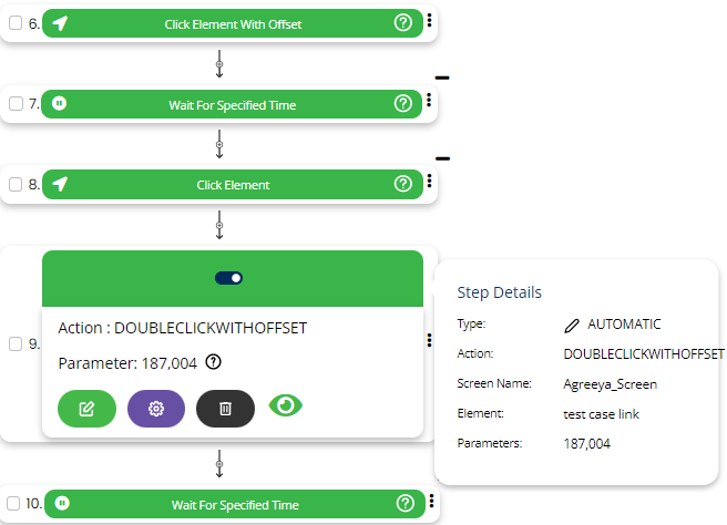 Select DOUBLECLICKWITHOFFSET command from the action drop down, select desired Screen name, Element key and provide offset vales in the parameter section as shown below: