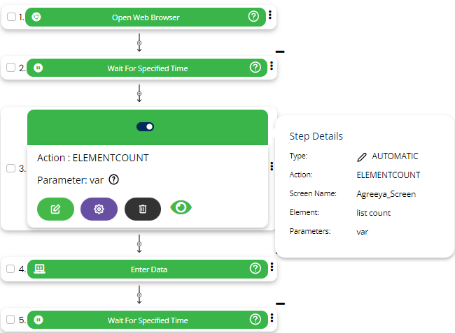 Select ELEMENTCOUNT command from the action drop down, select desired Screen name, Element key and provide the variable name which will store the count in parameter section as shown below: