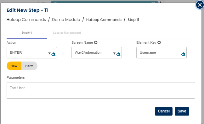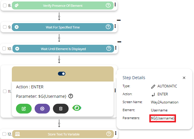 Select ENTER command from the action drop down, select desired Screen name and Element and pass the data/value in parameter section as shown below: