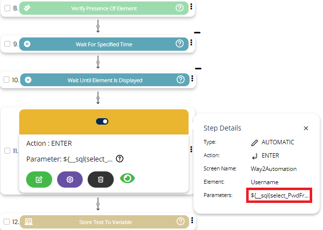 Select ENTER command from the action drop down, select desired Screen name and Element and pass the data/value in parameter section as shown below: