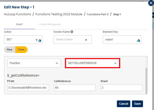 Select SET command from the action dropdown and provide a variable name in Element key where output will be stored, edit parameter section and click on Form, select functions from the dropdown and select GETCELLREFERENCE function. Provide file path, cell reference and sheet number.