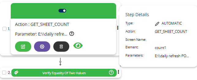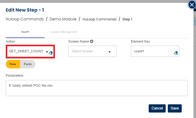 Select GET_SHEET_COUNT command from the action drop down, leave Screen name blank, Give variable name in the Element key where sheet count will be stored and provide excel file path in parameter section as shown below: