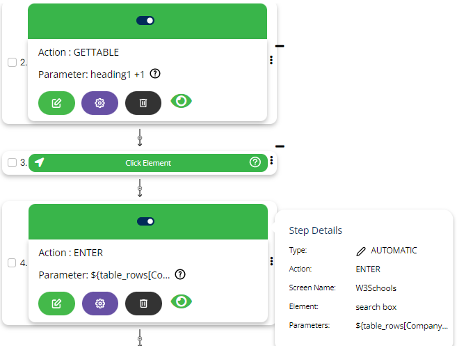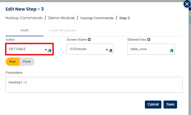 Select GETTABLE command from the action drop down, select desired Screen name, Element key [first locator (this locator should identify all the rows)] and provide second locator (this locator should identify all headings) in parameter section. User can avoid or ignore first heading using +1 after the second locator as shown below: