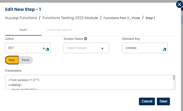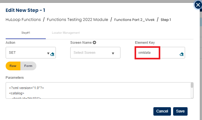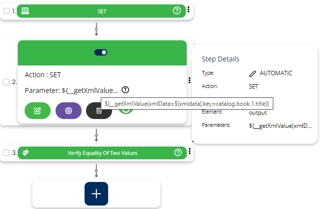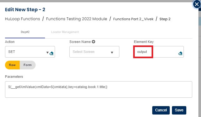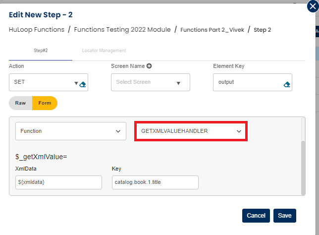 Select SET command from the action dropdown and provide a variable name in Element key, edit parameter section and click on Form, select functions from the dropdown and select GETXMLVALUEHANDLER function. Provide xmlData and key to fetch the desired xml value.