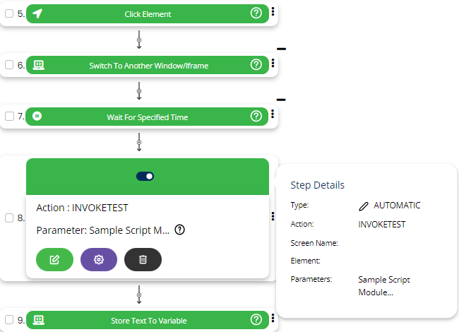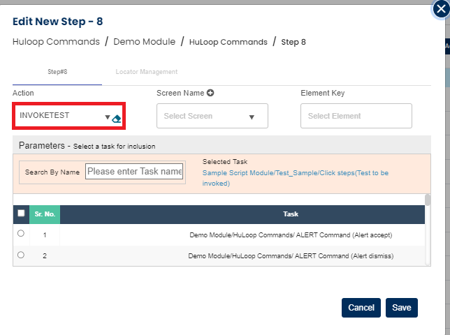 In this case after selecting INVOKETEST command from the action drop down select screen, Element key and test case to be invoked from the parameter section.