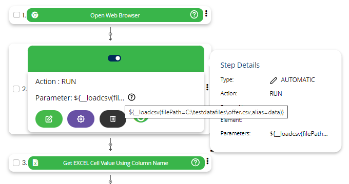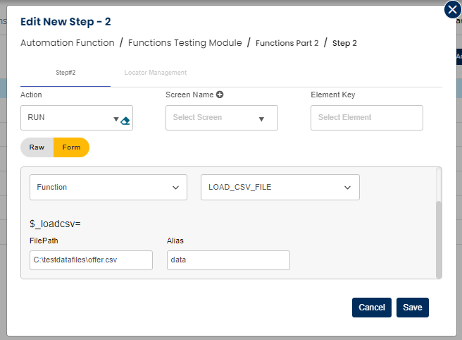 Select RUN command from the action dropdown, leave screen and Element key as blank, edit parameter section and click on Form, select functions from the dropdown and select LOAD_CSV_FILE function. Provide alias name and file path.