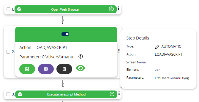 Loadjavascript command is used to load a Javascript file in memory. The file path should be mentioned in the parameter section and the loaded file can be referred by a name mentioned in the element key section.
