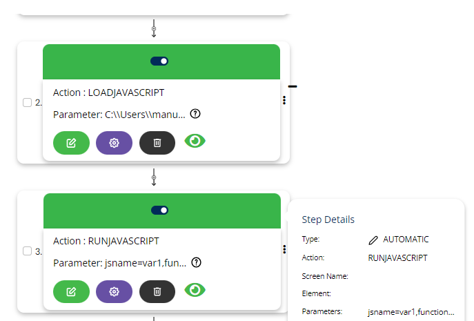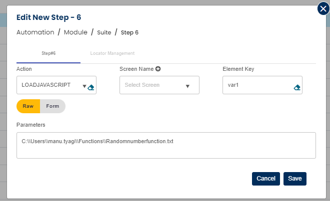 Select LOADJAVASCRIPT command from the action drop down, leave Screen name blank, Give variable name in the Element key which will be used to refer the file and provide file path in parameter section as shown below: