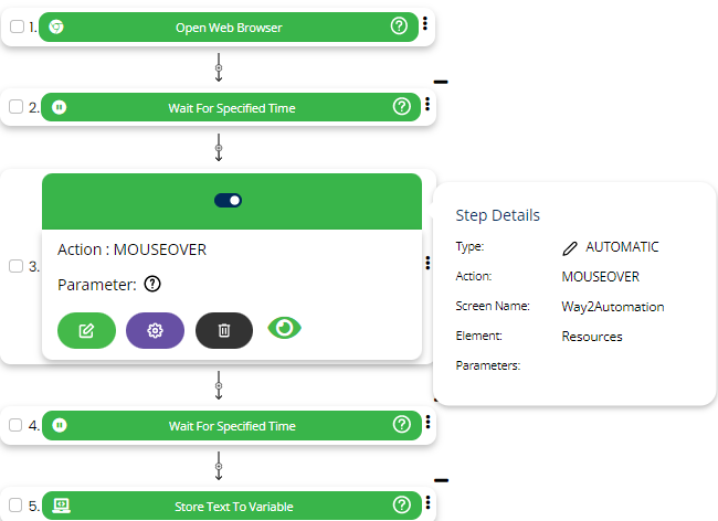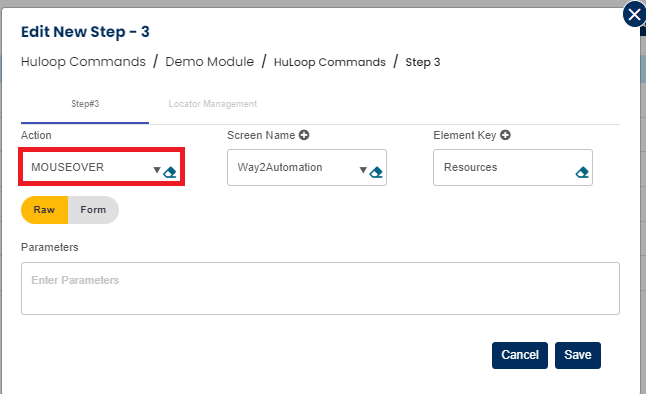 Select MOUSEOVER command from the action drop-down, select desired Screen name and Element where user wants to mouse hover, and leave the parameter section blank as shown below: