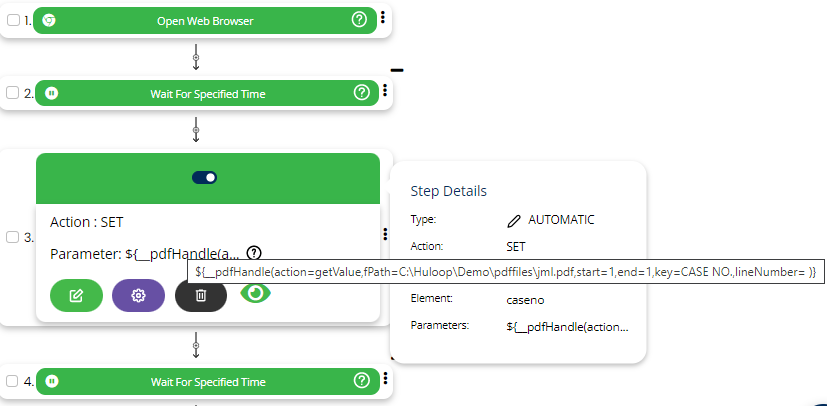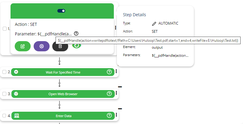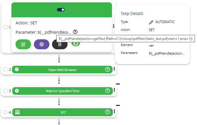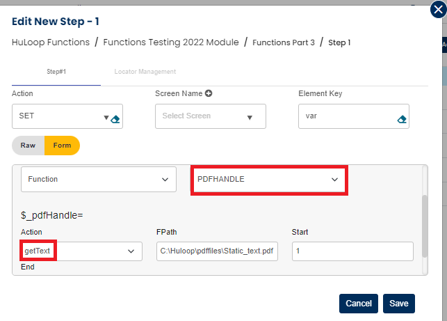 Select SET command from the action dropdown and provide a variable name in Element key where output will be stored, edit parameter section and click on Form, select functions from the dropdown and select PDFHANDLE function and then choose action as getText. Provide path of pdf file, start page count and end page count.