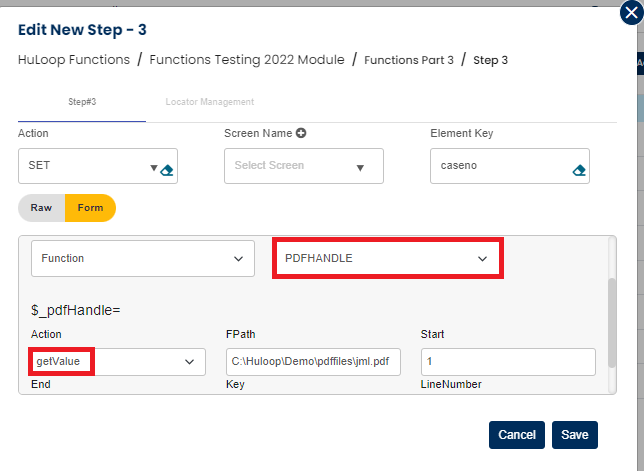 Select SET command from the action dropdown and provide a variable name in Element key where output will be stored, edit parameter section and click on Form, select functions from the dropdown and select PDFHANDLE function and then choose action as getValue. Provide path of pdf file, start page count and end page count and key against which the value you have to store.