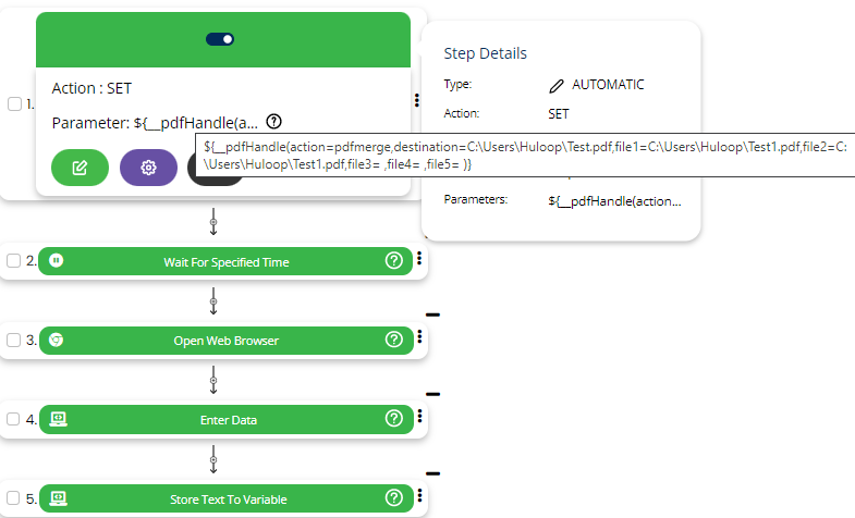 Select SET command from the action dropdown and provide a variable name in Element key where output will be stored, edit parameter section and click on Form, select functions from the dropdown and select PDFHANDLE function and then choose action as pdfmerge. Provide path of pdf file for destination in which all other pdf files will get merged and provide multiple pdf files path that you want to merge.
