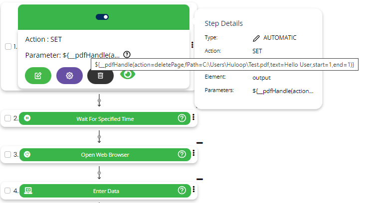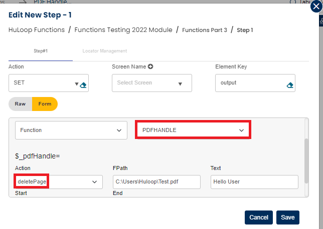Select SET command from the action dropdown and provide a variable name in Element key where output will be stored, edit parameter section and click on Form, select functions from the dropdown and select PDFHANDLE function and then choose action as deletepage. Provide path of pdf file, start page count, end page count and text which will be used to delete text containing page(s).