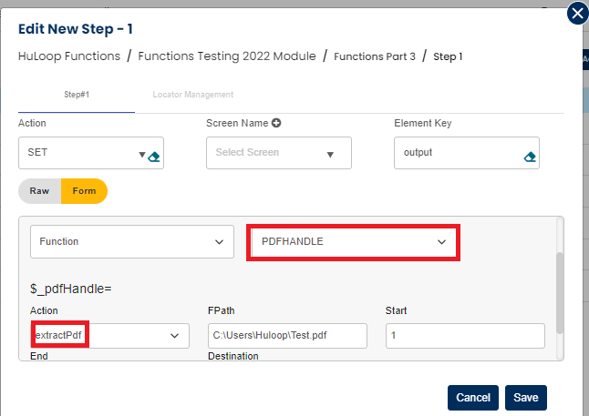 Select SET command from the action dropdown and provide a variable name in Element key where output will be stored, edit parameter section and click on Form, select functions from the dropdown and select PDFHANDLE function and then choose action as extractpdf. Provide path of pdf file, start page count, end page count, destination file path and in destination file data will be copied from start to end count of the page.