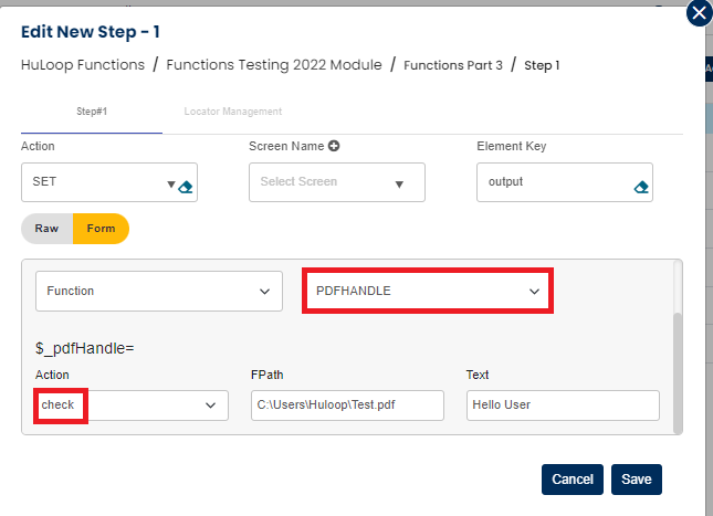 Select SET command from the action dropdown and provide a variable name in Element key where output will be stored, edit parameter section and click on Form, select functions from the dropdown and select PDFHANDLE function and then choose action as check. Provide path of pdf file, and text. This check action functionality is used to check the checkbox which is beside the given text.