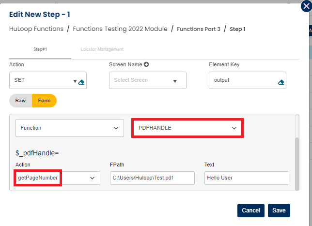 Select SET command from the action dropdown and provide a variable name in Element key where output will be stored, edit parameter section and click on Form, select functions from the dropdown and select PDFHANDLE function and then choose action as getpagenumber. Provide path of pdf file, and text. This getpagenumber action functionality is used to return the page number of first occurrences of text.