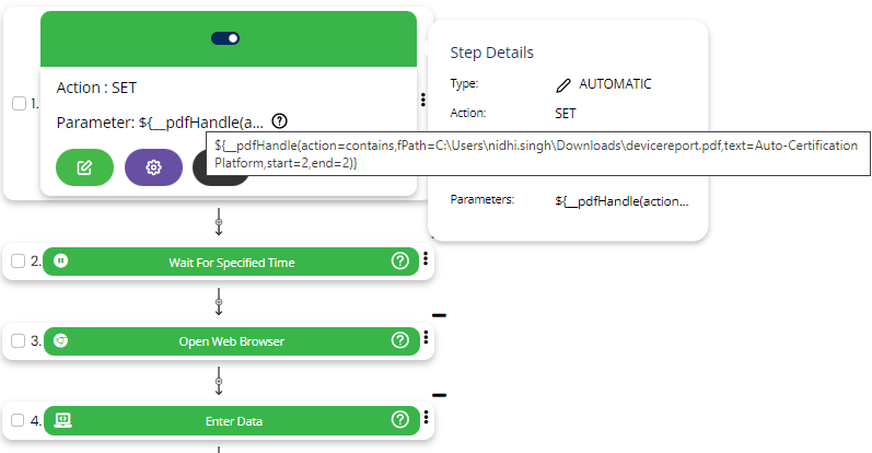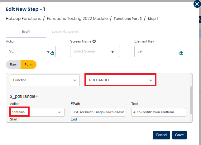 Select SET command from the action dropdown and provide a variable name in Element key where output will be stored, edit parameter section and click on Form, select functions from the dropdown and select PDFHANDLE function and then choose action as contains. Provide path of pdf file, text to be searched in the pdf file, start page count and end page count.