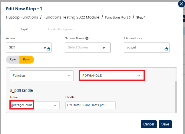 Select SET command from the action dropdown and provide a variable name in Element key where output will be stored, edit parameter section and click on Form, select functions from the dropdown and select PDFHANDLE function and then choose action as getPageCount. Provide path of pdf file.