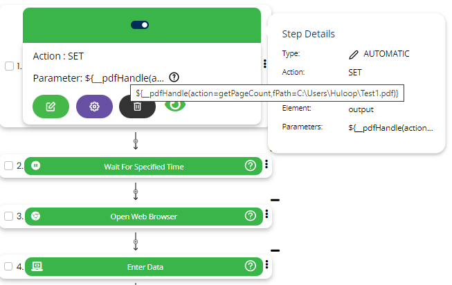 Count of pages in the pdf file will get stored in a variable defined in Element key. After completing the step it will look as below: