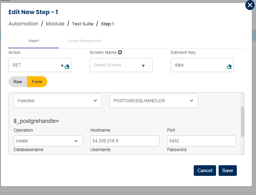 Select SET command from the action dropdown and provide a variable name in Element key, edit parameter section and click on Form, select functions from the dropdown and select POSTGRESQLHANDLER function. Select operation as create, provide hostname, port, databasename, username, password and sqlquery.