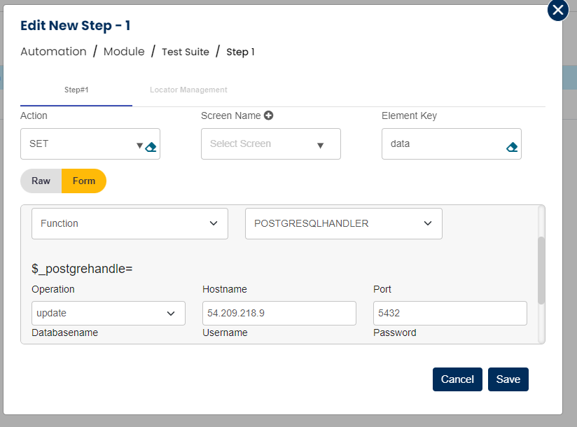 Select SET command from the action dropdown and provide a variable name in Element key, edit parameter section and click on Form, select functions from the dropdown and select POSTGRESQLHANDLER function. Select operation as update, provide hostname, port, databasename, username, password and sqlquery.