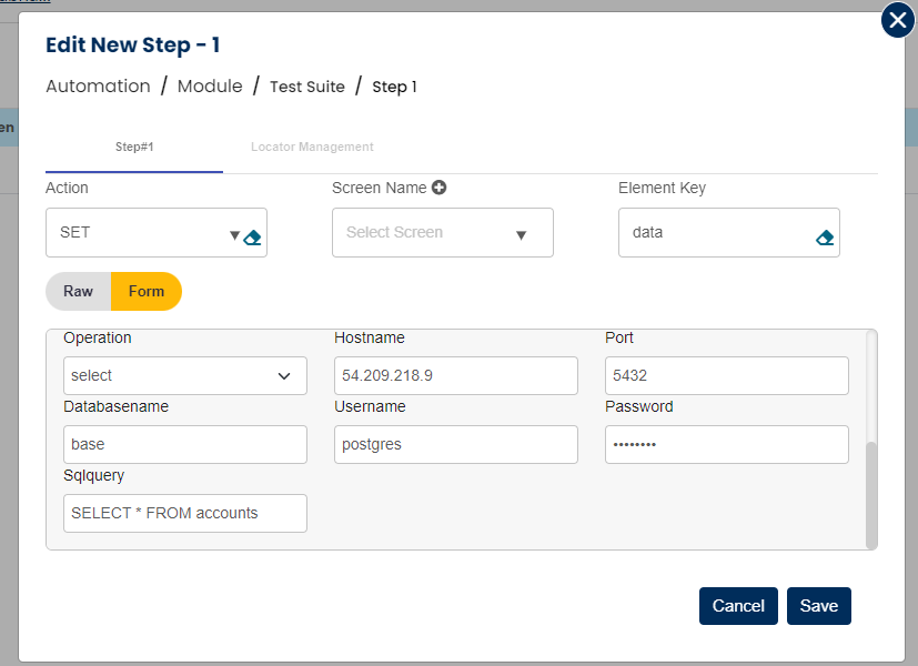 Select SET command from the action dropdown and provide a variable name in Element key, edit parameter section and click on Form, select functions from the dropdown and select POSTGRESQLHANDLER function. Select operation as select, provide hostname, port, databasename, username, password and sqlquery.
