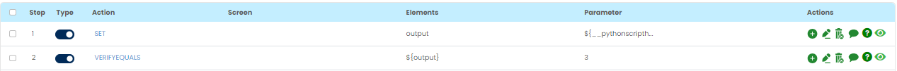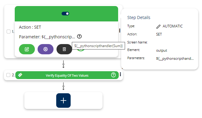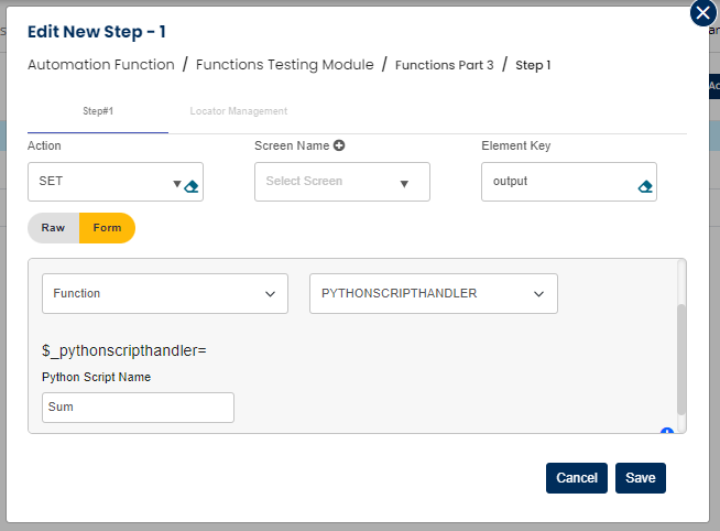 Select SET command from the action dropdown and provide a variable name in Element key where output will be stored, edit parameter section and click on Form, select functions from the dropdown and select PYTHONSCRIPTHANDLER function. Provide name of the function which you have given in Data > Manage python scripts.