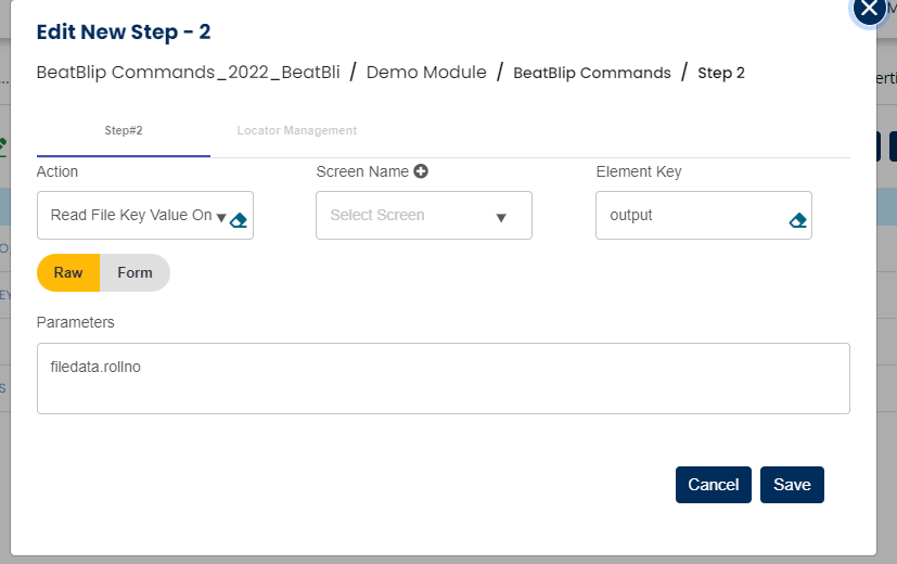 Select READ_FILE_KEYVALUE command from the action drop down, leave Screen name and set variable in Element field, enter file name and property name in parameter section as shown below: