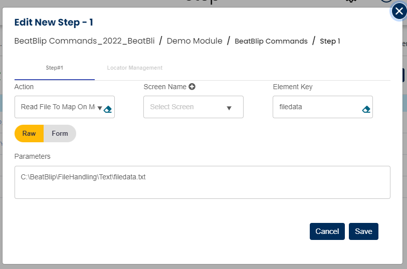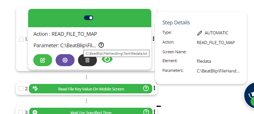 Read_file_to_map command is used to read data from a file and assigns it to a map. File path should be provided in parameter section and variable which represents the map in element section as shown below :