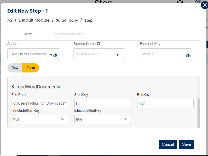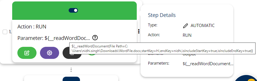 Select the RUN command from the action dropdown and provide a variable name in the Element key. Edit the Parameters section and click on Form. Select functions from the dropdown and select the READWORDDOCUMENT function. Provide File Path, StartKey, EndKey, IsIncludeStartKey and IsIncludeEndKey.