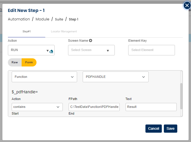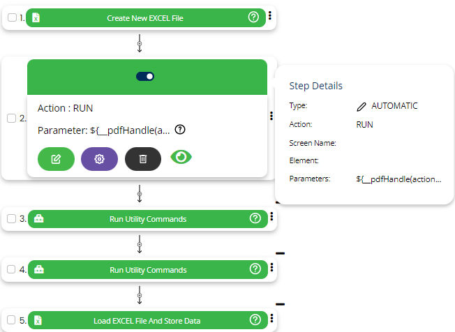 Run command is used to trigger several utility functions and plugins available like pdfcontains, executecase, pdftable, pdftable, loadexcel, etc.