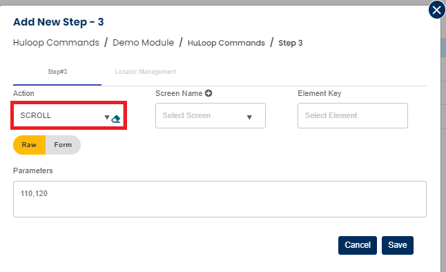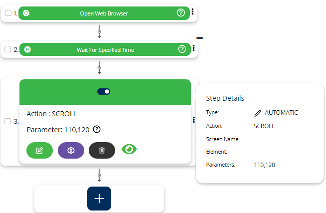 Select SCROLL command from the action drop down, leave Screen name, Element key as blank and pass the number of pixels to scroll in parameter section as shown below: