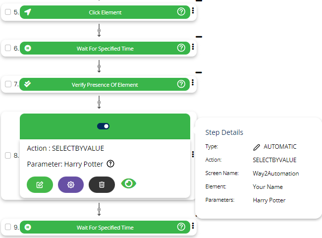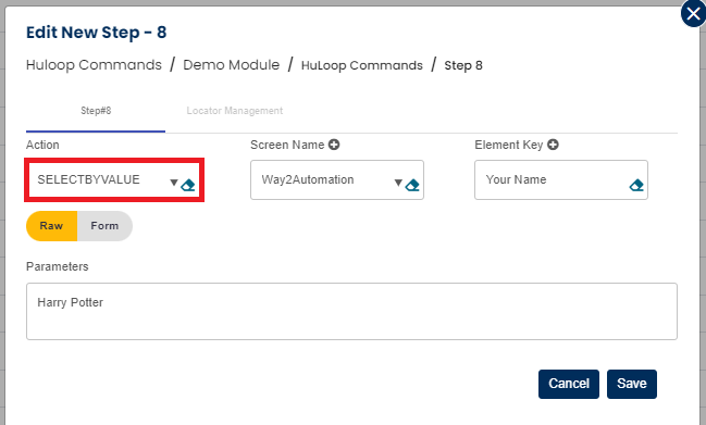 Select SELECTBYVALUE command from the action drop down, select desired Screen name, Element key and provide the drop down list item value to be selected as shown below: