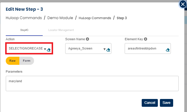Select SELECTIGNORECASE command from the action drop down, select desired Screen name and Element and pass the option to be selected (here upper case and lower case will be ignored) in parameter section as shown below:
