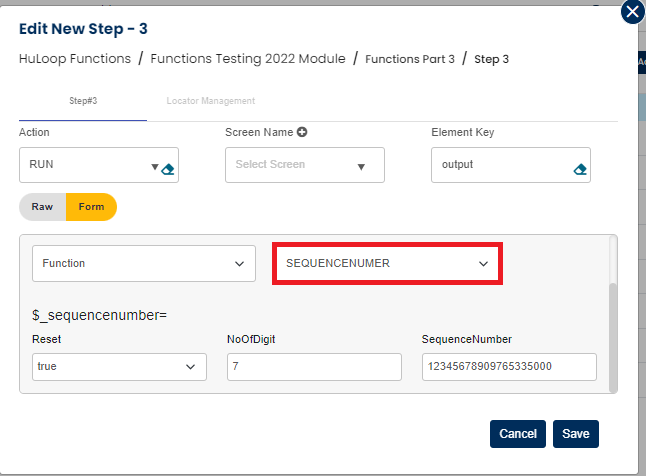 Edit parameter section and click on Form, select functions from the dropdown and select SEQUENCENUMBER function. Select reset value as true or false (If true is selected every time this function is called it will start from the given value and if false is selected it will continue adding itself by one from the starting sequence number ), provide number of digits and start number of the sequence.
