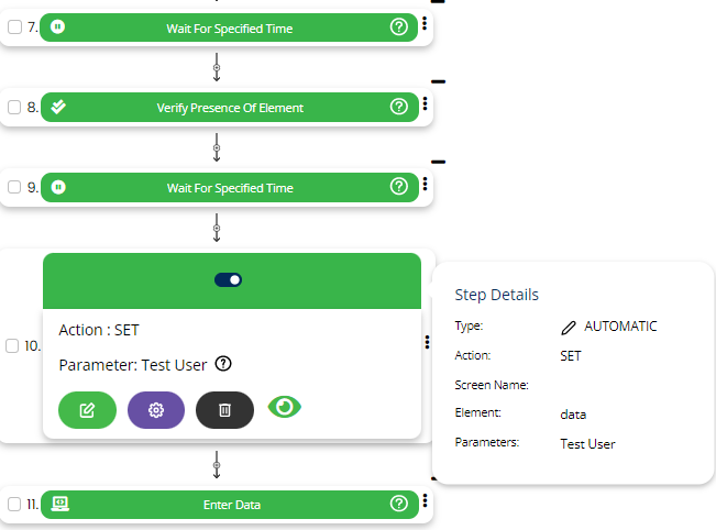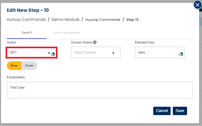 Select SET command from the action drop down, leave Screen name blank, Give variable name in the Element key and provide its value in parameter section as shown below: