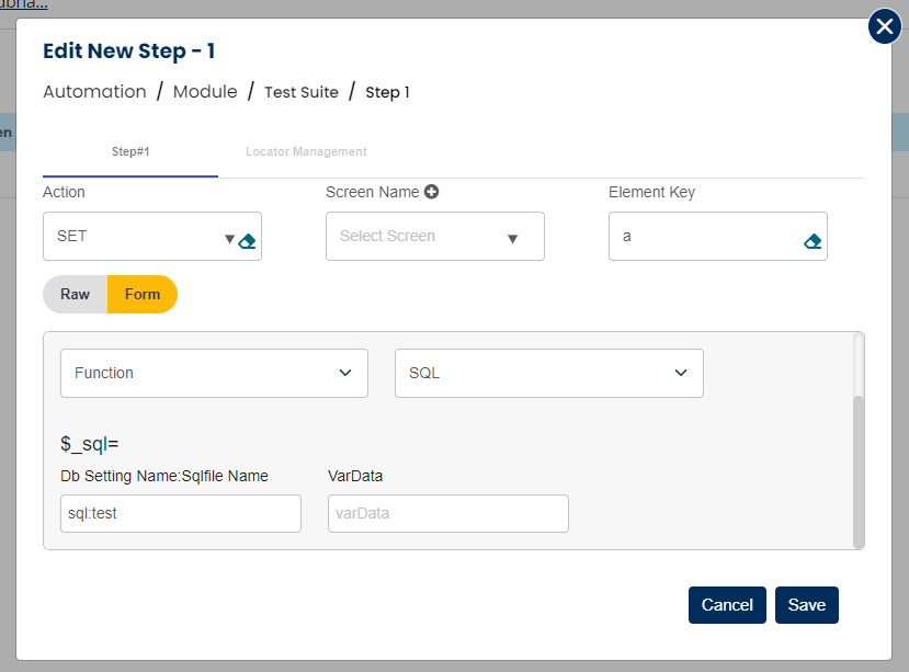 Select SET command from the action dropdown and provide a variable name in Element key where output will be stored, edit parameter section and click on Form, select functions from the dropdown and select SQL function. Provide DB setting name and SQL file name separated by colon(:), and varData if there is any data to be given in the script.